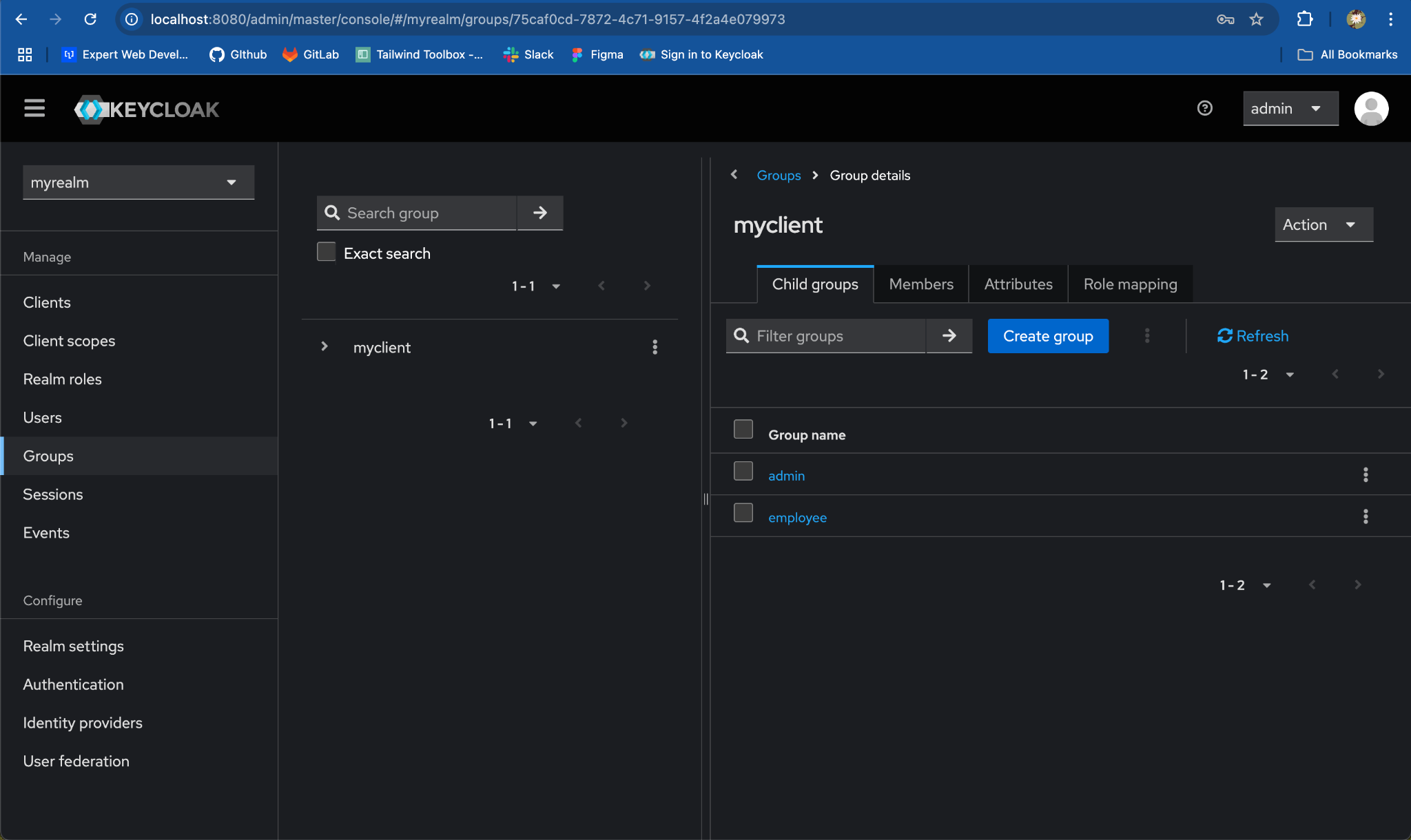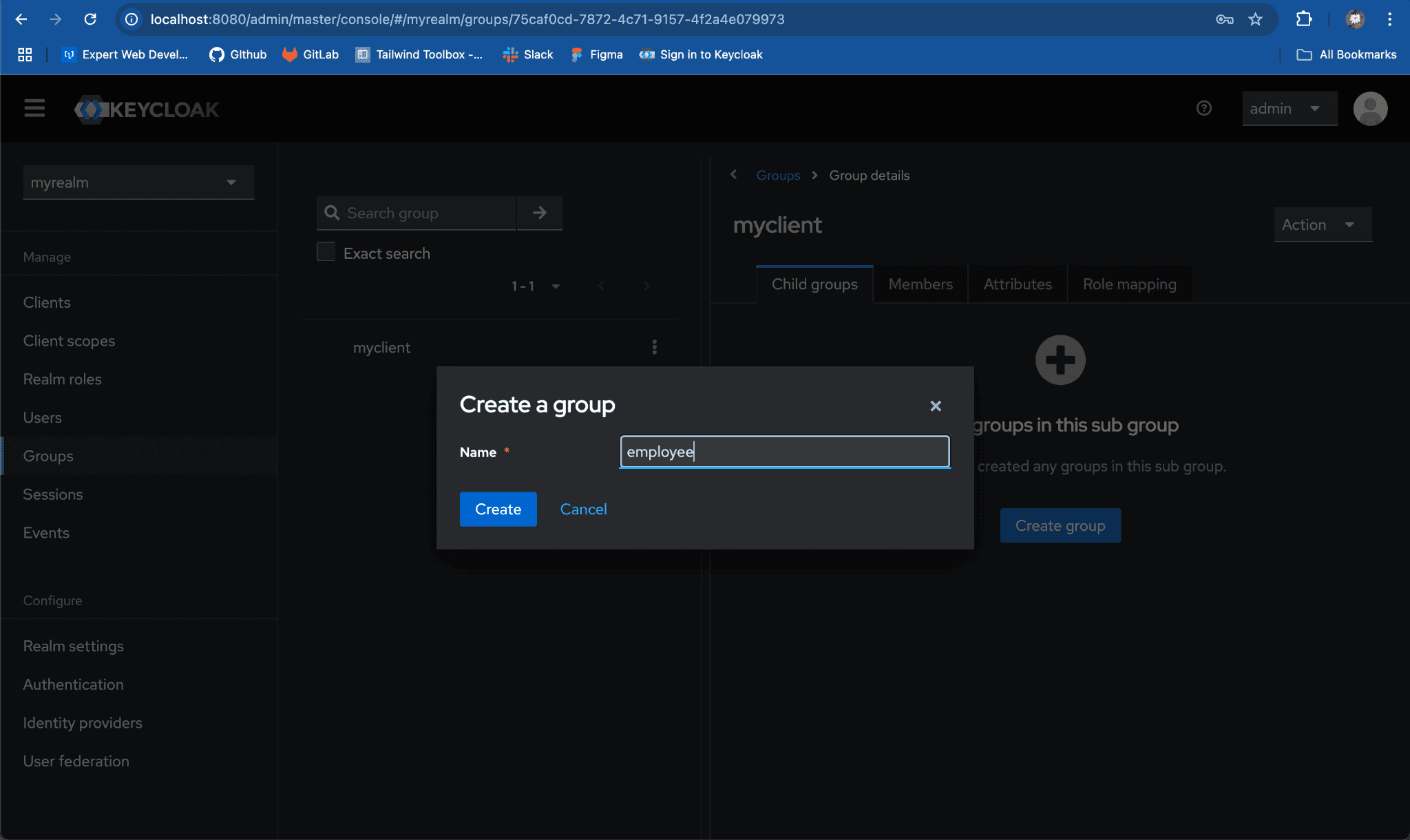 Child Groupstab, clickCreate groupand add the group name same as client role, e.g.employee. ClickSave.