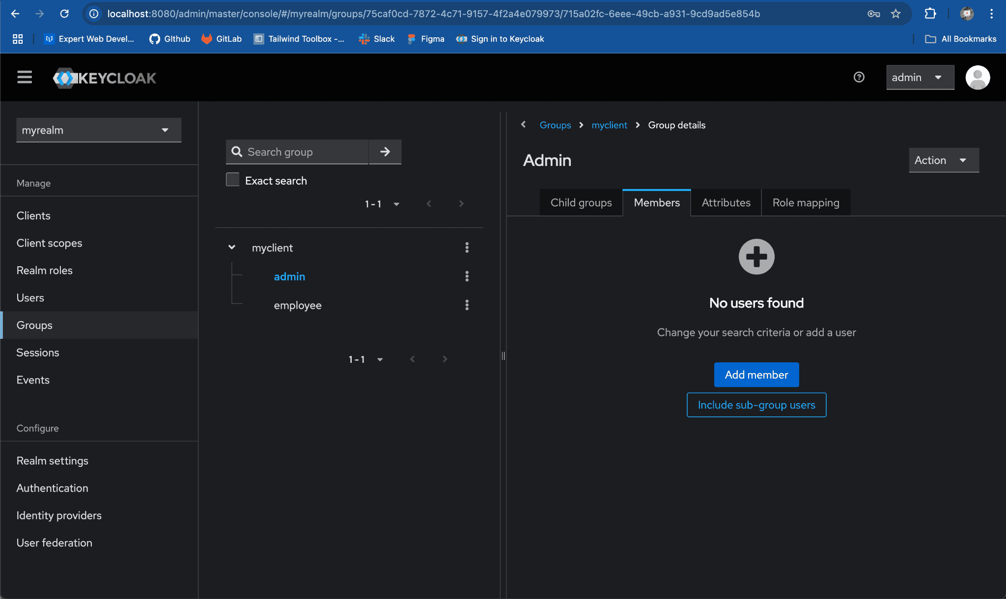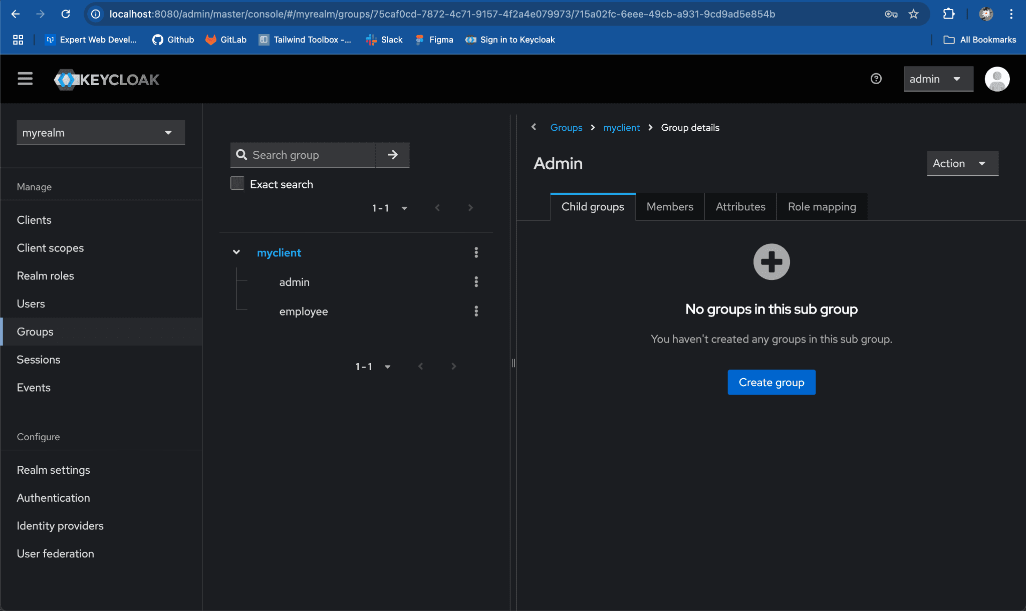 Child Groupstab, clickCreate groupand add the group name same as client role, e.g.employee. ClickSave.