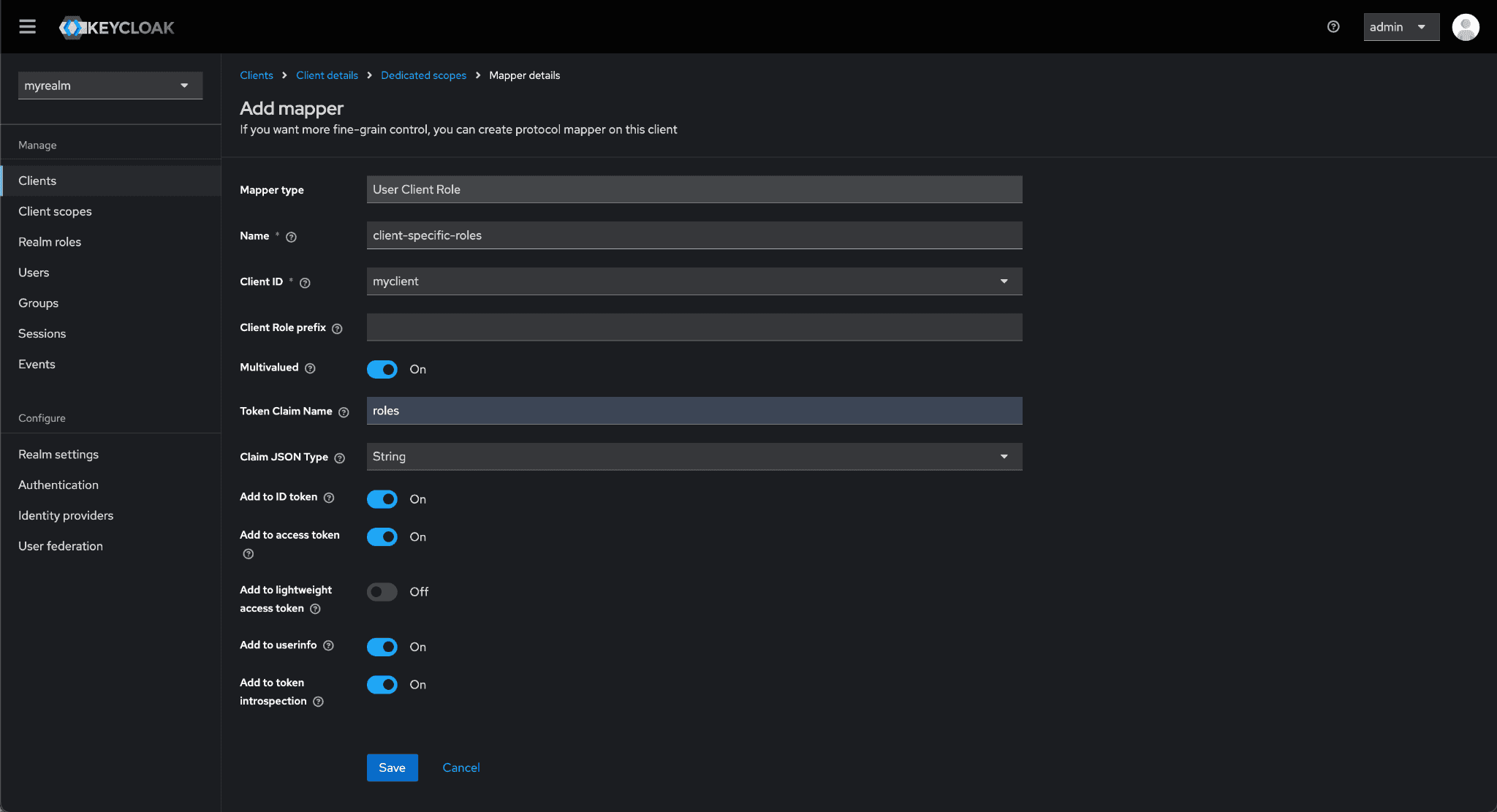 Enable Add to ID token, Add to access token, Add to userInfo and click on Save.